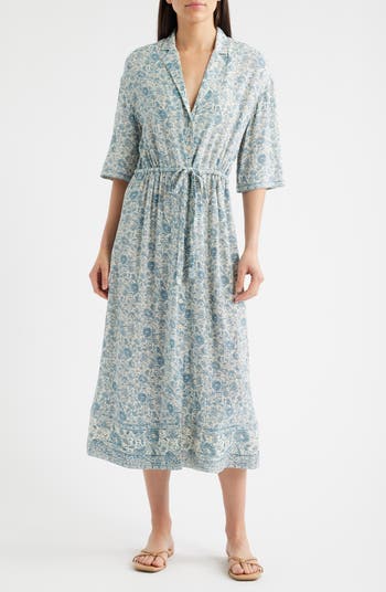 A light and airy midi shirtdress is romanced by vintage-inspired blooms and centered with a slender waist tie to shape the silhouette.