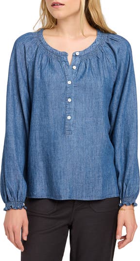Sweet smocking trims this easy denim top designed with front buttons and soft gathers.
