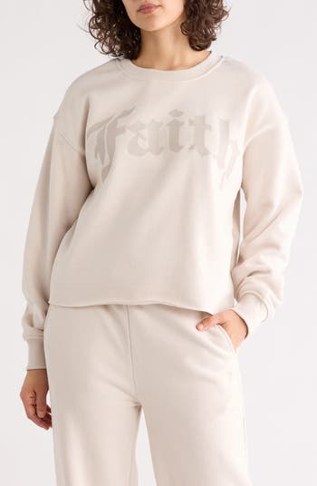 Faith meets finesse in this cozy cotton-forward crewneck sweatshirt featuring an Old English script logo and finished with a raw-edge hem.