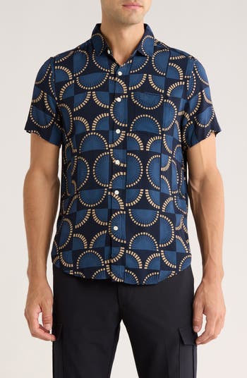 Effortlessly transition from soirée to sunny celebration in this breezy twill button-up styled with a cool geometric fan print.