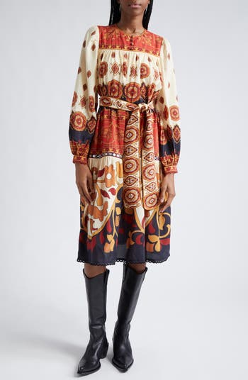 Decorative buttons and an ornate floral pattern make this tie-waist dress a bold and charming option for your next occasion.