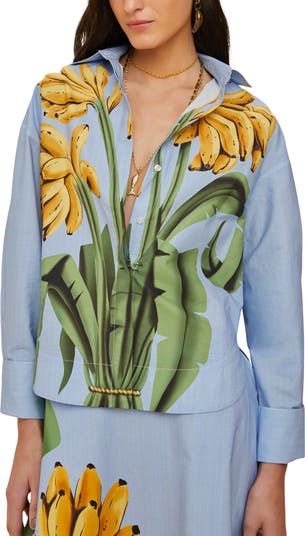 Dream of the tropics when you style this relaxed-fit button-up shirt rendered in thin stripes topped with vibrant graphics of ripe banana bunches and swaying fronds.