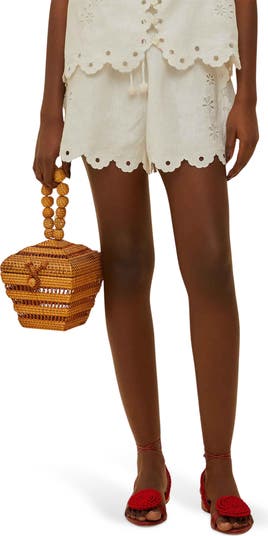 Intricately stitched flowers and embroidered eyelets sweeten airy linen shorts framed by a comfy elastic-drawstring waist and a playfully scalloped hem.