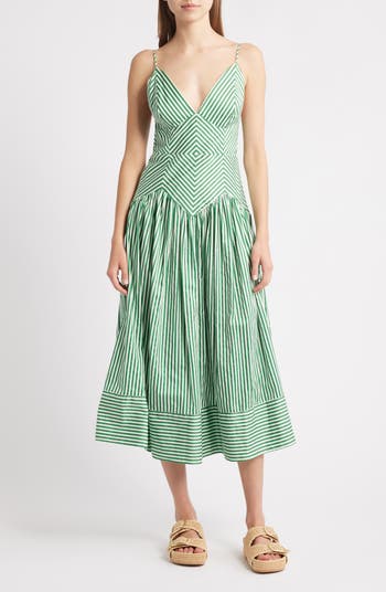 Crisp stripes add unmistakable modern character to a woven cotton midi dress in an A-line silhouette.