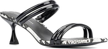 Tubular straps shape the open toe upper of a kitten heel sandal that is set on a snake embossed square toe footbed.
