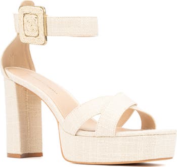 Crisscross vamp straps and an ankle strap are created from a textured woven that wraps the platform sole of this warm weather sandal.