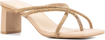 Pavé crystals bring elegant sparkle to a strappy slide sandal lifted by a slender block heel.