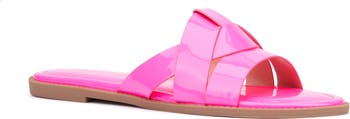 Faux leather straps shine with a patent finish that highlights the style of a sleek slide sandal with an interwoven strap.