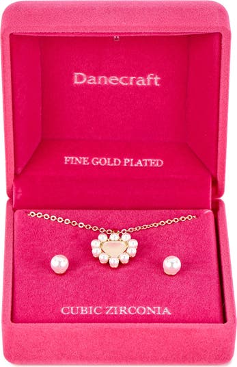 A faux pearl frame lends lovely luster to this heart pendant necklace and coordinating stud earrings set.
