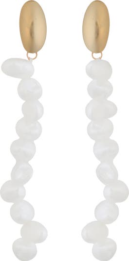Show off beachy shine with faux-pearl linear earrings composed of gleaming ovals suspending squiggly beaded drops.