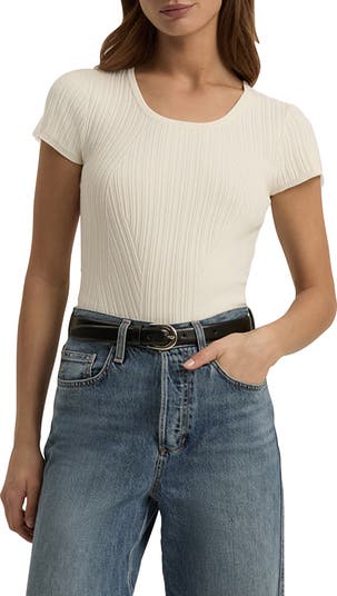 Layer from work to play in this close-fitting knit top textured with variegated ribbing and framed by abbreviated sleeves.