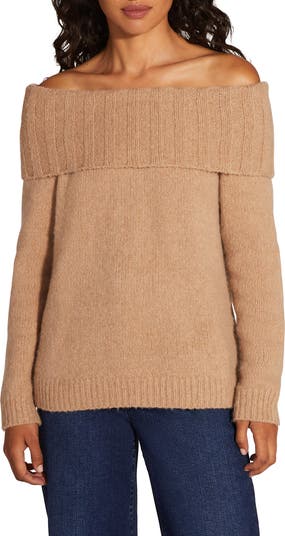 Move easily from day to night in this woolly cashmere-kissed sweater knit in a shoulder-baring silhouette with a folded ribbed neckline.