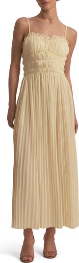 Soft shirring adds gathered dimension to the fitted bodice of this frill-trimmed maxi dress made from accordion-pleated chiffon to enhance its airy romance.