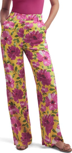 A garden of brilliant flowers rendered in vivid hues blooms across trouser-inspired pants cut from sleek satin in a breezy wide-leg silhouette.