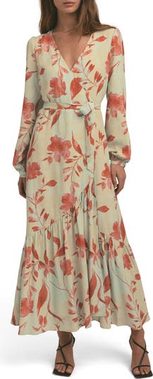 Voluminous blouson sleeves frame a romantic wrap dress that has a flurry of asymmetric ruffles on the ankle-skimming skirt.