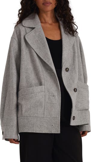An allover herringbone pattern brings warmth to this three-button jacket designed with oversized lapels and handy front pockets.