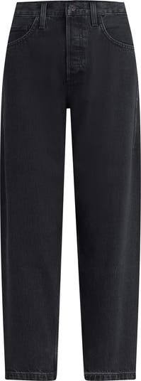 Made from vintage-vibe nonstretch denim, these mid-rise jeans curve out at the knee to create a contemporary barrel silhouette.