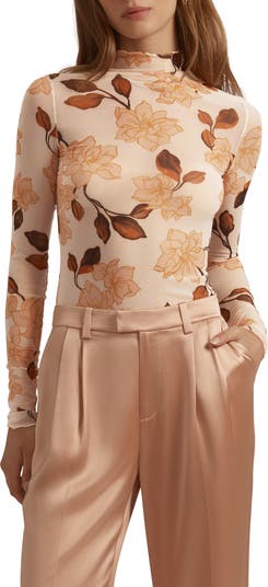 Cut from gauzy mesh and kissed with stretch, this soft figure-skimming top is made with a sophisticated mock neck and covered in a lively print.