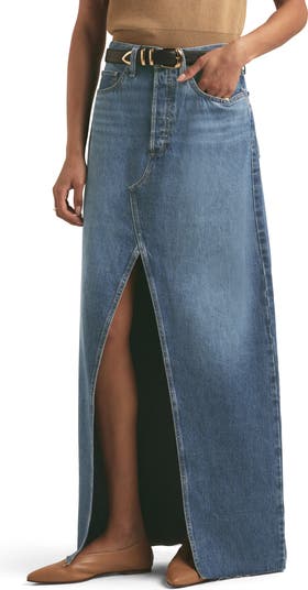 A dramatic front slit brings bold movement to this maxi skirt cut from softly faded denim.
