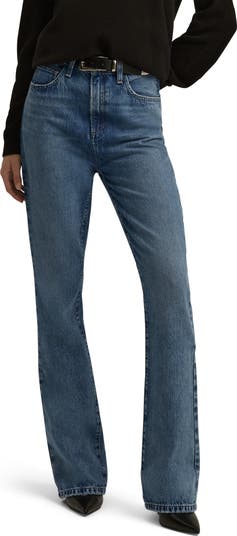 A high waist and floor-sweeping legs create a streamlined, elongated effect in these soft, medium-wash bootcut jeans.