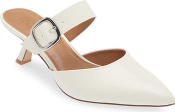 A glossy, gleaming buckle secured the wide vamp strap of a pointed-toe pump finished with a backless design for a care-free appeal.
