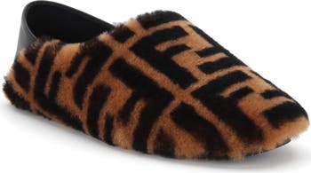 Deck (or just stroll) the halls in the luxe comfort of this shearling slipper detailed in the Fendi monogram and featuring a slipper-to-slide collapsible heel.