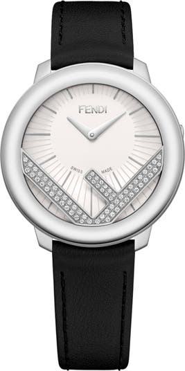 An off-center opaline dial rises over the geometric F that anchors the face of a Swiss-precision watch with 59 sparkling diamonds glamming up the polished steel case. The softly tapered hands echo the shape of the calfskin leather strap to complement the clean-lined, elegant design.
