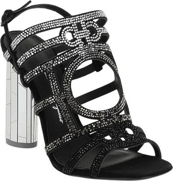 Glistening white crystals outline the Gancini-inspired caged silhouette of this sandal balanced upon a mirrored block heel.