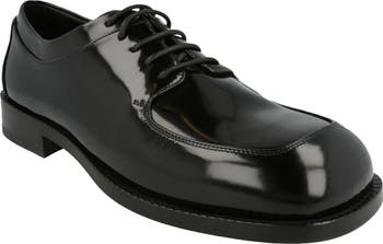 An embossed Gancini logo brands the heel of this moc-toe derby handcrafted in Italy from smooth calfskin leather.