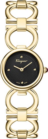 Ferragamo's signature double gancini form the bracelet links framing this Swiss-made round watch for an accessory that keeps you impeccably on trend and on time.