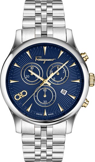 Complications: Date window; elapsed-seconds, -minutes and -hours subdials.