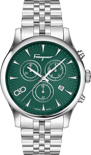 The iconic double Gancino logo captures the essence of Ferragamo's craftsmanship on the guilloche dial of this refined chronograph watch powered by precise Swiss quartz movement.