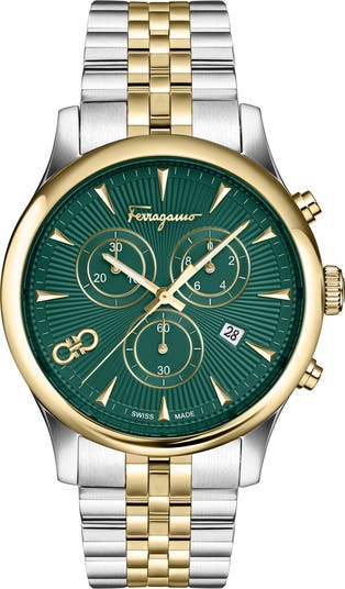 A double Gancino logo brings branded charm to the guilloche dial of a sophisticated chronograph watch engineered with Swiss