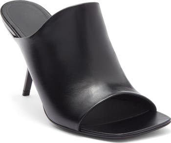 A squared-off toe and angled stiletto heel furthers the futuristic aesthetic of an Italian-made leather mule for a sleek, architectural look.
