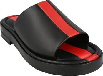 The fiery racing stripe extending across the upper is mirrored in the footbed of this calfskin-leather slide sandal masterfully crafted in Italy.