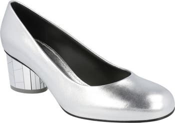 A round toe and geometric-mirrored block heel balance a sleek pump crafted in Italy from smooth metallic leather.