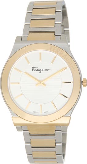 This elegant Swiss-made watch conveys true craftsmanship and luxury with its textured dial, slim indexes and two-tone bracelet.