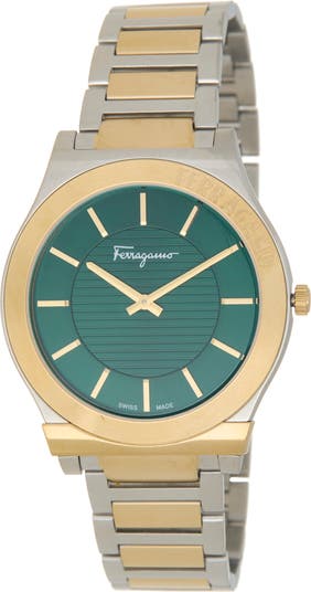 This elegant Swiss-made watch conveys true craftsmanship and luxury with its textured dial, slim indexes and two-tone bracelet.