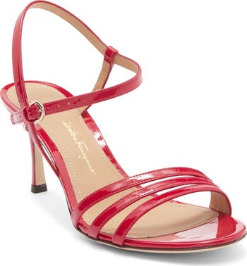 A signature Gancio buckle secures the svelte ankle strap of this Italian-made leather sandal with a glossy patent finish.