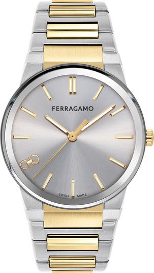 A fine sunray dial mesmerizes on this Swiss-made watch featuring a signature double-Gancio playing at eight.