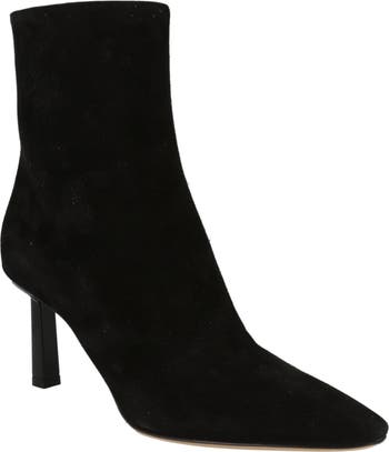 Elevate your cold-weather ensembles with this ankle-cut suede boot styled with a pointed toe and balanced upon a stiletto heel.