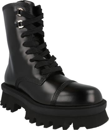 Soft laces glide easily through gancini-shaped hardware of a streetwise boot furnished with an amplified lug grip sole for reliable traction.