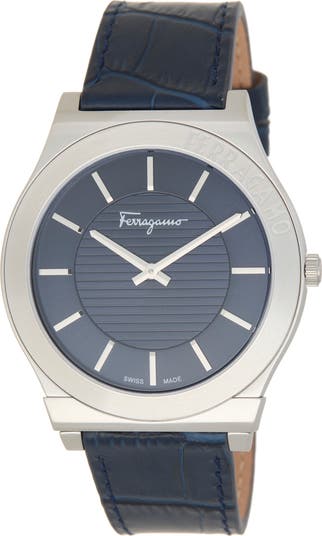Show off sophisticated style with this croc-embossed leather-strap watch boasting a guilloche dial with precise two-hand movement and clear dash indexes.
