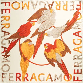 A logo border frames a heritage design of a pandemonium of parrots on this Italian-made square scarf in pure silk foulard.