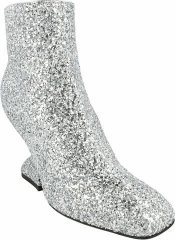 A style made for celebrations, brilliant glitter covers an Italian-made ankle boot balanced on a sculptural, inverted heel.