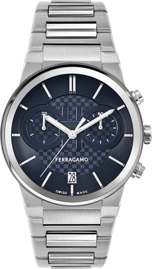 Gancini symbols stamp the check-textured dial of a sophisticated three-hand watch marked by slender stick indexes and powered by an accurate Swiss movement.