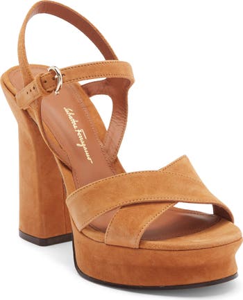 A signature Gancio buckle secures the slim ankle strap of this Italian-made platform sandal rendered in buttery suede.