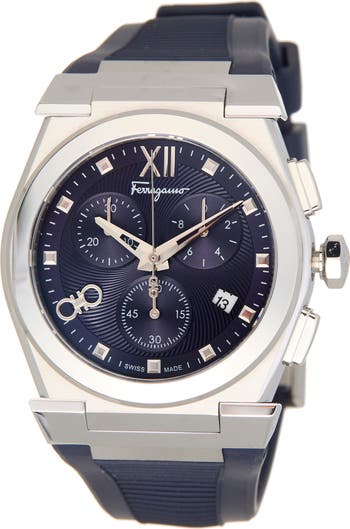 Bring sophisticated style to daily looks with this polished chronograph watch boasting a guilloche dial with precise three-hand movement, a clear date window and three subdials.