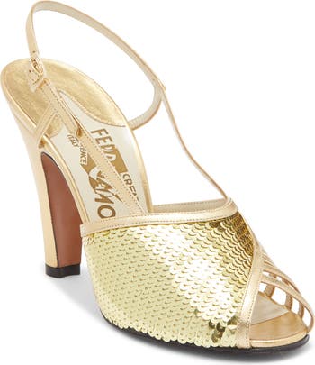 Shimmering sequins and metallic leather bring undeniable glamour to this strappy slingback sandal elevated on a sculptural