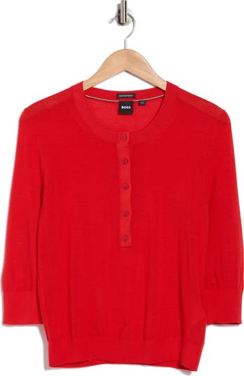 A half placket at the front brings a more laid-back style to this luxe virgin-wool sweater framed by three-quarter sleeves.